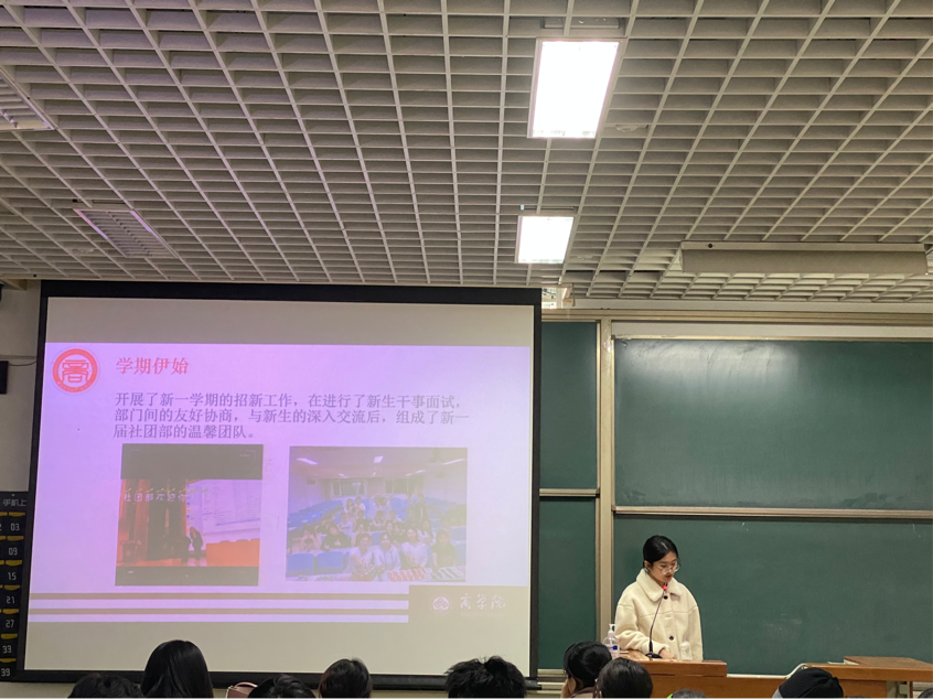 总结会上,学院团委副书记赵方洲、王怡玲、李宇涵分别介绍学院团委组织部、团建部、新闻部、班建部、宣传部、社团部等建设情况,总结了本学期学社衔接、素质拓展、团校、征兵宣传、新闻宣传等工作开展情况;学生会执行主席王明溪、主席团成员李千晴、吕天逸分别介绍了办公室、体育部、生活部、心资部、学术部、文艺部、舞团等部门的招新和发展情况,总结了本学期新生运动会、129合唱及表彰、模拟人生、新生篮球足球赛、辩论赛等各项工作取得成绩和有待改进的方面;青志协会会长陈沐渟介绍了青志协、外联部的工作情况,对本学期开展的有关志愿服务等工作进行了总结。