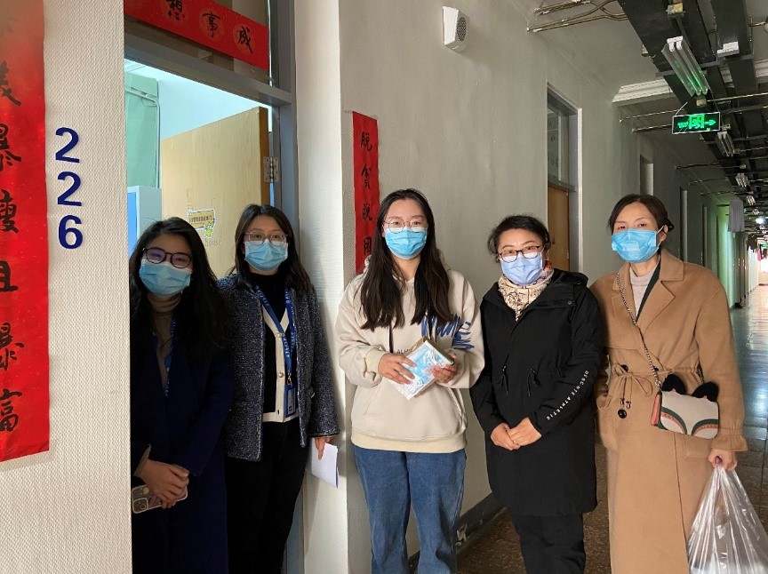 5月4日,学校因周边疫情导致进入临时管控状态,学院驻校辅导员再次深入本科生宿舍看望学生,并为学生送去口罩等防疫物资。