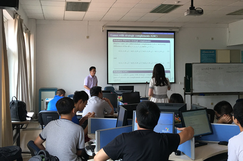 在讲座中,曹志刚老师指出超模博弈和位势博弈重要且有用,超模博弈与策略互补博弈相似,用生动的例子给大家介绍了策略互补和策略替代的概念。他指出超模博弈和位势博弈有很好的研究前景,目前研究的少,由于二者有很好的性质,且有很好的经济管理解释,在实际生活中有很多应用,十分重要。最后,学生积极向曹老师就相关问题展开讨论。一些同学还就自己的论文进行了讲解展示,曹老师提出了一些宝贵的意见和建议。他指出论文的选题要聚焦到一个点,切忌宽泛,使用的模型应讲清楚为什么适合这个研究方法,结论应明确清晰,同学们都受益匪浅。