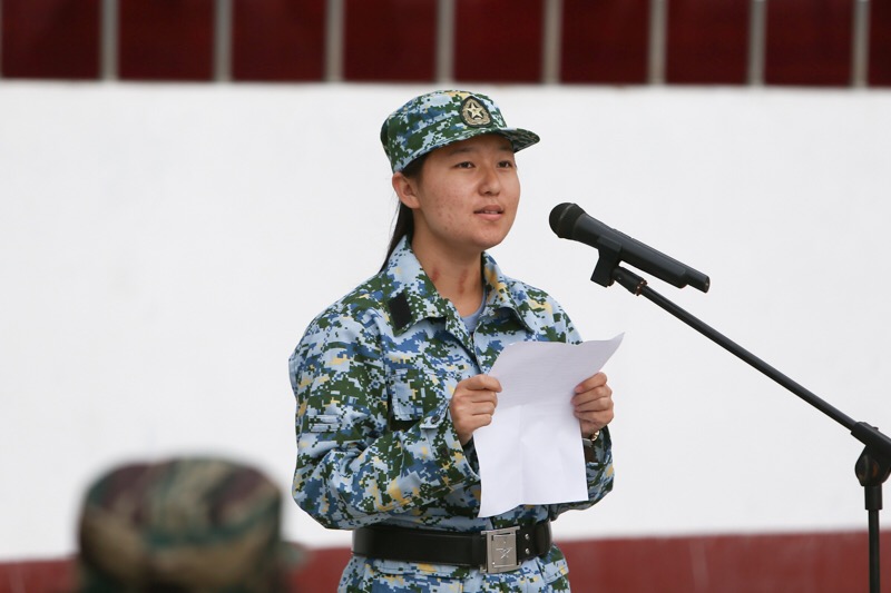 参训学员代表康静是我院注会163班的同学,她代表全体参训学员向教官、老师庄严承诺:军训期间发扬不怕苦、不怕累的革命乐观主义精神,以积极快乐的心态对待军训,坚决服从命令、听从指挥、严守纪律,严格训练,高质量的完成所有的军训科目。她铿锵有力的发言展示了色控
