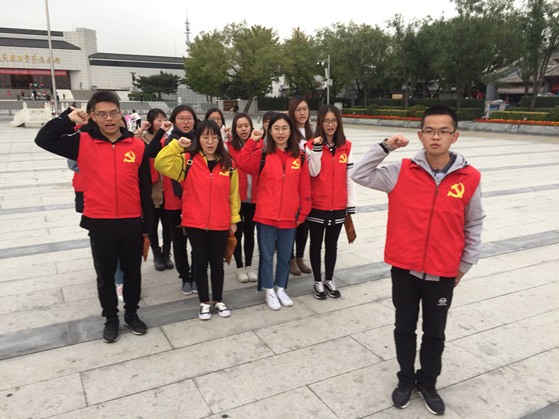 在抗日战争纪念馆前,全体党员在第六学生党支部书记岳志余的带领下重温入党誓词。