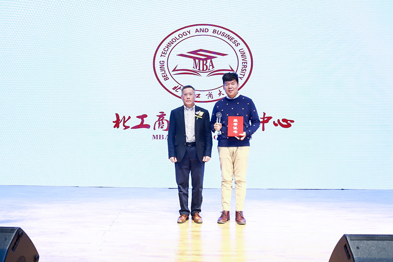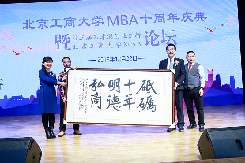 十年成长,反哺感恩。首届北工商MBA学员为学院献礼牌匾,色控 院长王国顺、MBA教育中心执行主任王楠作为院校代表接受礼赠。