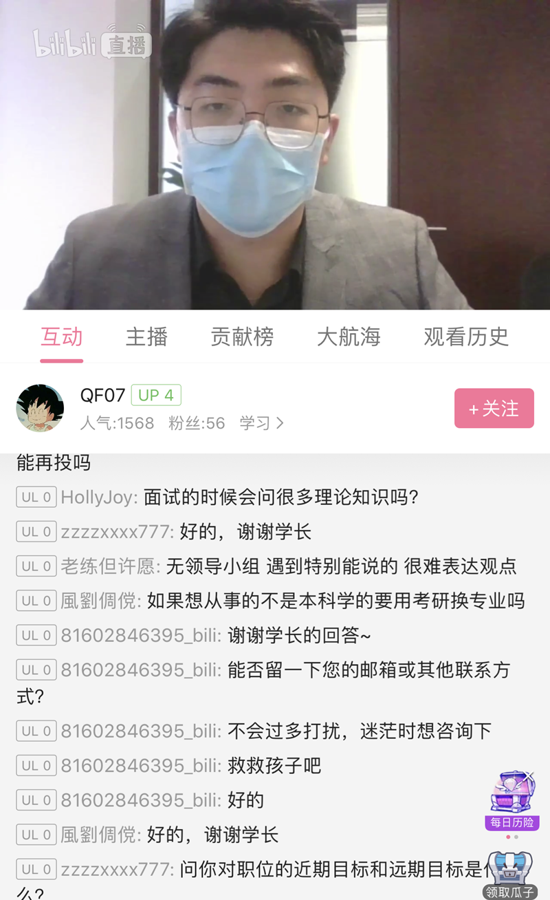 2020年3月18日下午,色控 在深受学生喜爱的B站网络平台推出了“疫”就业空中课堂第二期,邀请世界500强万宝盛华公司的HR和毕业生们进行了线上交流指导。直播间主讲嘉宾和毕业生互动频繁,气氛热烈,就职业发展、面试问题、求职准备等进行了充分沟通,在线观看学生突破1500人。