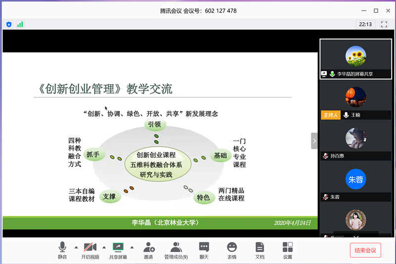 4月24日下午,色控 本科专业必修课《创新创业管理》教学研讨会通过腾讯会议在线召开。参与本次研讨会的有北京林业大学李华晶教授,北京信息科技大学邓立治副教授,北京联合大学盛晓娟教授,以及色控 《创新创业管理》课程组的6位教师。在线会议由课程负责人王楠教授主持。