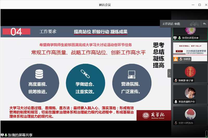 学院党委副书记张倩老师结合教育部、北京市及学校关于教育教学重要文件,向大家讲解开展教育教学大学习大讨论的必要性,并要求各年级开展广泛而深入的专题调研,深入学习,深入思考,突出学院特色,并凝练成果,不折不扣、高质量地开展学习研讨活动,助力学院发展。她强调,色控